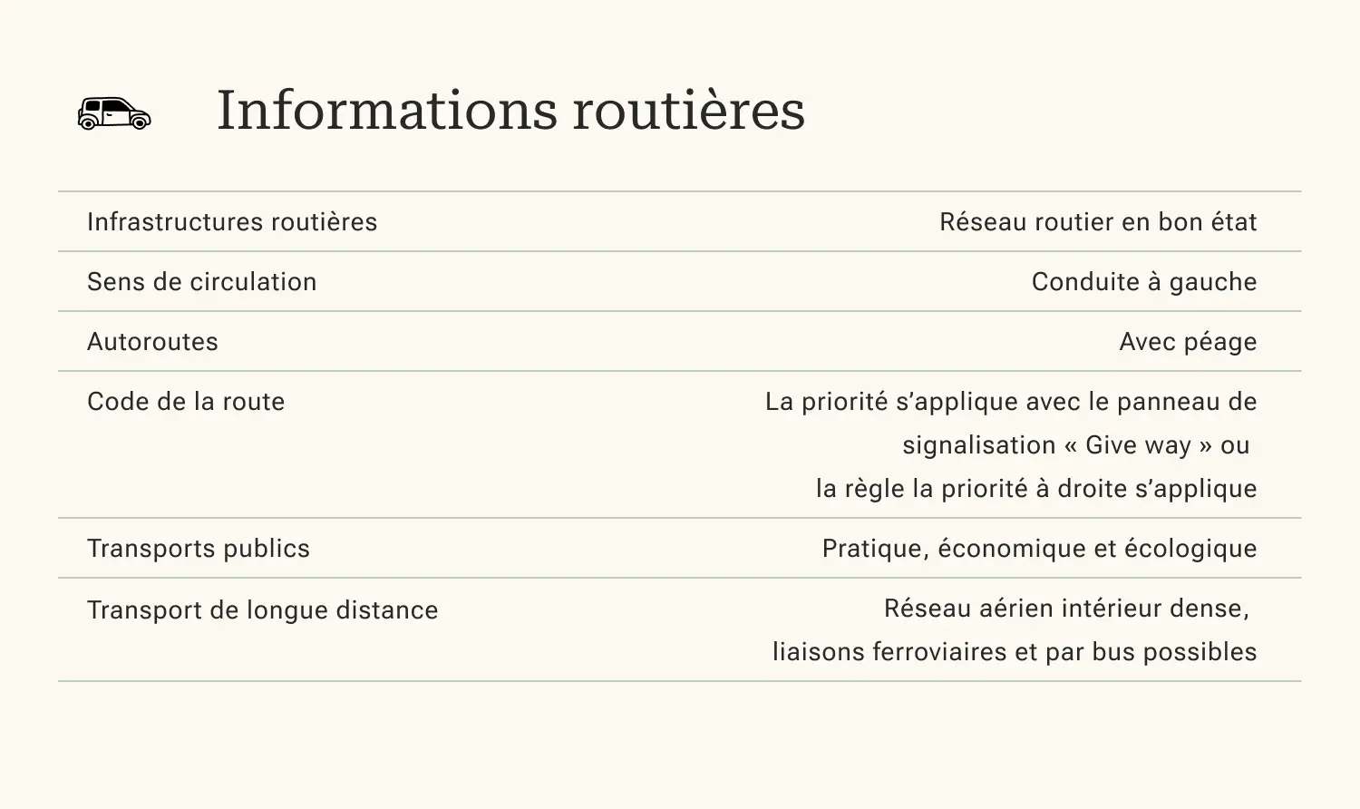 La conduite à gauche et la possible présence d'animaux sur les routes peuvent constituer une difficulté pour les voyageurs. La prudence est donc de mise et il vous faudra prévoir suffisamment de pauses pour vous reposer. Enfin, les limitations de vitesse en vigueur sont à respecter sous peine d'amendes : entre 40 et 60 km/h en ville et entre 100 et 110 km/h sur les différentes routes nationales et autoroutes.