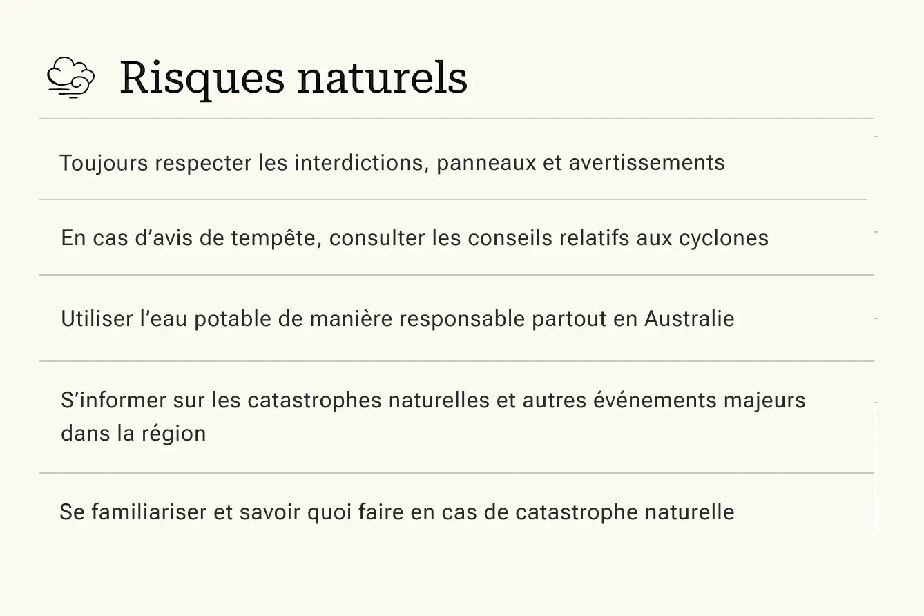 Dans le nord de l'Australie en particulier, des phénomènes cycloniques et des inondations se produisent régulièrement entre novembre et avril. De plus, plusieurs régions, dont les villes de Sydney, Canberra et Melbourne, connaissent des moments de forte dégradation de l'air en raison d'incendies. Il est vivement recommandé de consulter les infos et consignes à ce sujet auprès des autorités sanitaires locales.