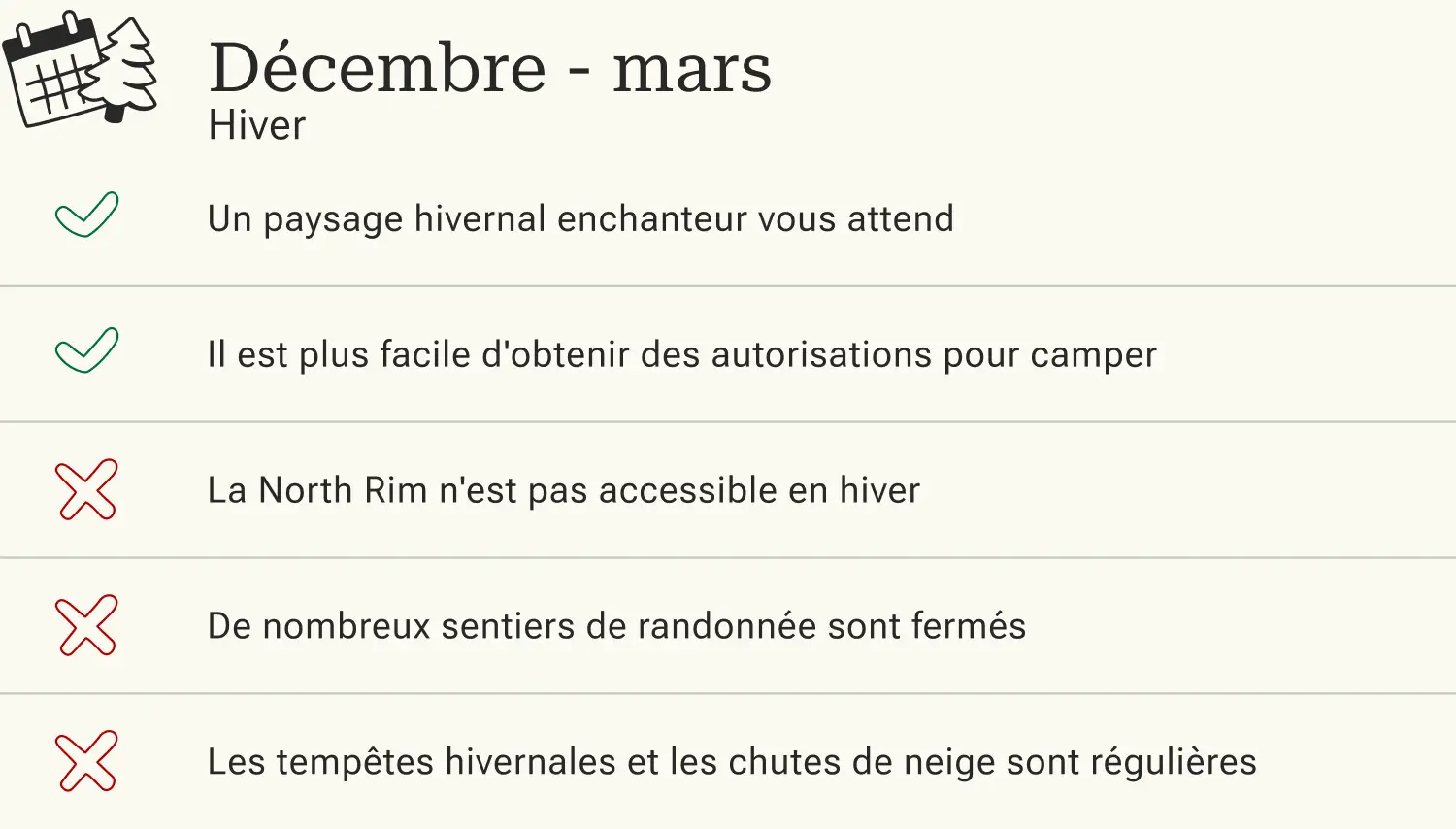 Pendant les mois d'hiver (décembre, janvier et février), les journées plus courtes, les heures d'ensoleillement moins nombreuses, les températures plus froides et les chutes de neige régulières rendent le parc sensiblement plus calme. Avec des températures comprises entre 7 et - 8°C, les voyageurs sont nettement moins nombreux à se rendre dans la région. Néanmoins, une visite s'impose pour profiter des paysages hivernaux époustouflants de la South Rim, sur des sentiers de randonnée sélectionnés ou pour camper dans l'Inner Canyon lorsque les températures sont plus douces. Vous pourrez ainsi découvrir de près la faune et la flore uniques du canyon. Seule la visite de la North Rim n'est pas possible en hiver, car cette partie du parc est fermée.