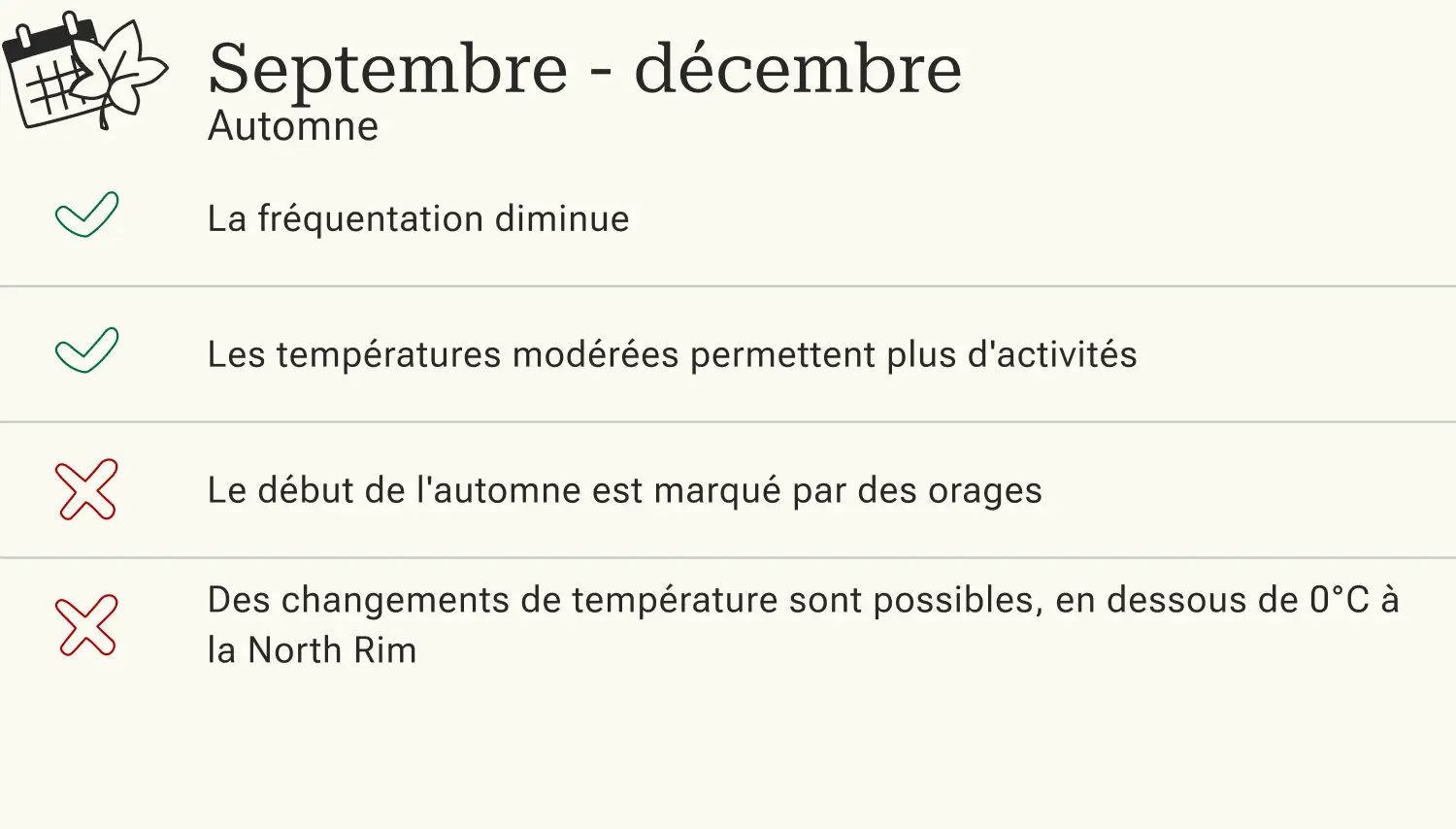 À partir de septembre, la chaleur estivale du Grand Canyon laisse place à des valeurs moyennes d'environ 25°C. Alors que les températures minimales ne descendent pas en dessous de 10°C à l'intérieur du canyon, elles descendent déjà en dessous de zéro sur le bord. La probabilité de pluie diminue également, ce qui vous permet d'explorer la région par un temps idyllique et avec moins de visiteurs. Néanmoins, il faut s'attendre à quelques orages au début de l'automne. À partir de novembre, il faut également faire attention aux brusques changements de météo, qui peuvent entraîner des tempêtes de neige et des températures froides.