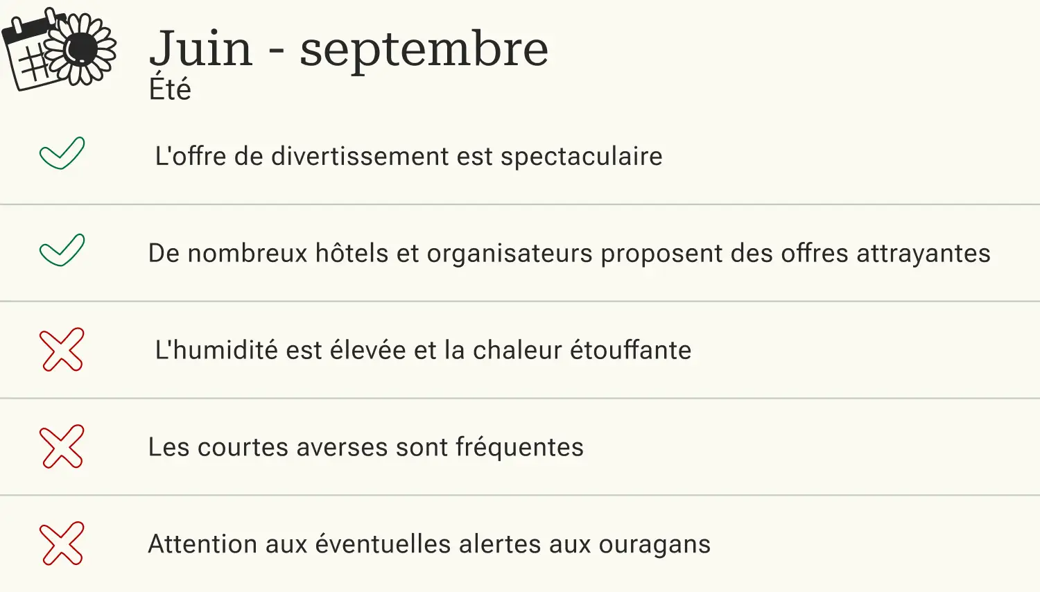 Malgré les températures chaudes, voire caniculaires, entre juin et août, les animations battent leur plein à Orlando. La ville attire en effet de par ses nombreux festivals et événements en plein air, de sorte que le divertissement est garanti. Alors que même les températures les plus basses ne sont pas inférieures à 25°C, seules les averses régulières et les orages parfois violents permettent de se rafraîchir. Si vous voyagez en été, faites attention aux éventuelles alertes aux ouragans, car le mois de juin marque le début de la saison des tempêtes et des pluies en Floride.
