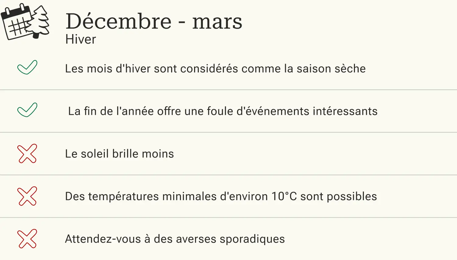 | Heures d'ensoleillement par jour | 8 | 9 | 10 | 10 | 9 | 10 | 10 | 9 | 9 | 8 | 8 | 8 | |