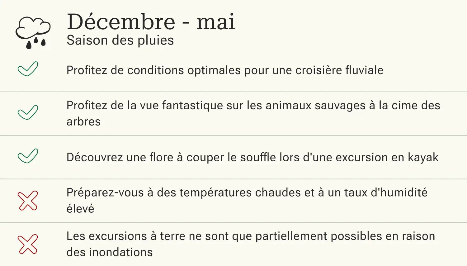 La saison des pluies en Amazonie s'étend de fin novembre à fin mai. Préparez-vous à des précipitations quotidiennes et à des rivières en crue. En raison des températures élevées constantes, qui peuvent atteindre 31°C, l'humidité de l'air augmente et le climat peut être étouffant. Gardez quand même en tête que c'est à cette période que l'Amazonie se montre sous son plus beau jour. Découvrez la végétation luxuriante et la faune fascinante de la région avec tous vos sens lors d'une passionnante croisière sur le fleuve Amazone.