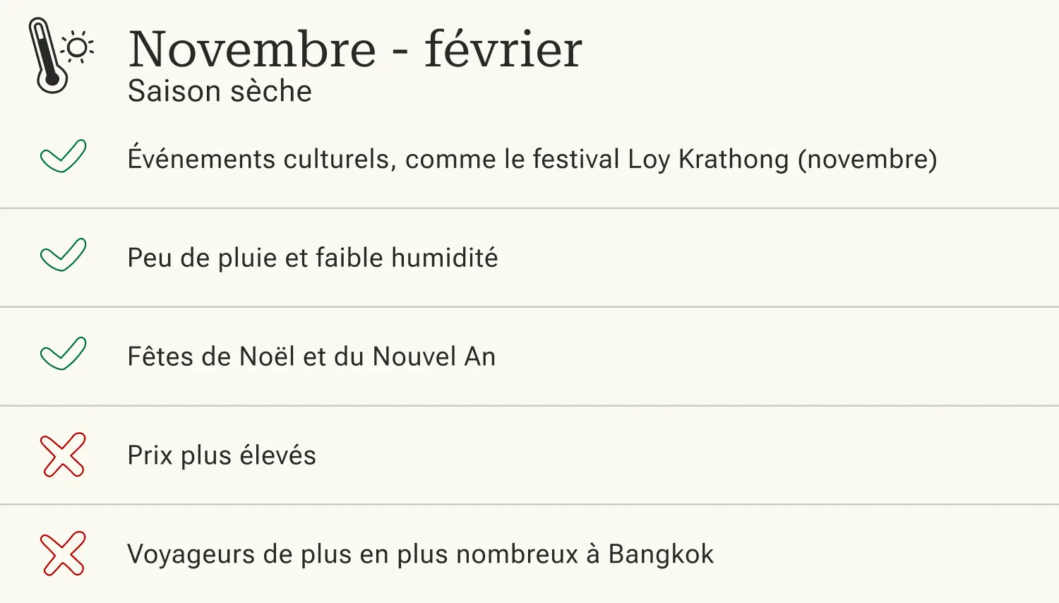 La saison sèche thaïlandaise s'étend de novembre à février. Malgré des températures élevées (plus de 30°C), des averses parfois violentes se produisent régulièrement. L'humidité de l'air est donc très élevée. Parallèlement, il fait jour plus longtemps jusqu'au début du mois de décembre, ce qui laisse beaucoup de temps pour explorer la capitale aux multiples facettes. Vous pouvez à cette période participer au World Gourmet Festival de Bangkok ou assister aux festivités traditionnelles comme Navaratri ou Loy Kratong.