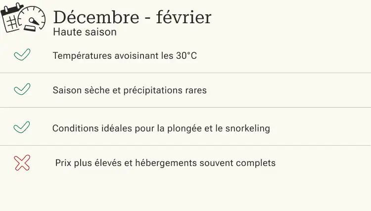 Entre décembre et mars, c'est la saison sèche et il ne pleut pratiquement pas. Par conséquent, la mer est calme et la visibilité sous l'eau particulièrement bonne pendant cette saison. La période se veut donc favorable pour s'adonner à la pratique de la plongée ou encore du snorkeling. Vous pourrez alors découvrir les trésors sous-marins de la mer d'Andaman dans des conditions idéales.
