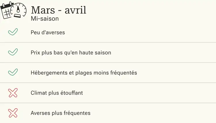 Alors que la saison des pluies est non seulement humide, mais aussi très étouffante, la saison sèche est nettement plus agréable. Il ne pleut pratiquement pas et l'humidité de l'air reste relativement supportable. Pour toutes les activités sportives, il est donc préférable de voyager pendant la saison sèche, entre décembre et mars. En outre, cela représente aussi le moment le plus opportun pour la pratique du yoga.