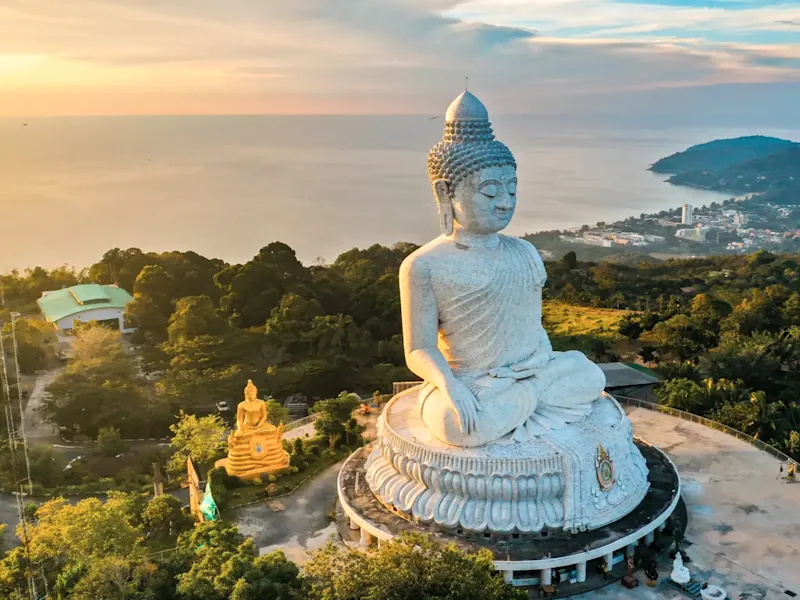 L'impressionnante statue de Bouddha Phra Phutta Mingmongkhon Akenakkhiri, haute de 45 mètres, est l'un des symboles de Phuket. Cela vaut la peine de s'y rendre non seulement pour explorer le fantastique temple et en apprendre plus sur la vie et l'œuvre de Bouddha, mais aussi pour profiter de la vue magnifique sur la pittoresque baie de Chalong. De plus, lors d'une excursion au Big Buddha, nous vous conseillons de vous arrêter à plusieurs reprises pour profiter de l'environnement spectaculaire en toute tranquillité ou découvrir l'une des attractions de la région, telles que des cafés confortables, un camp d'éléphants ou la vue sur la magnifique plage de Karon.
