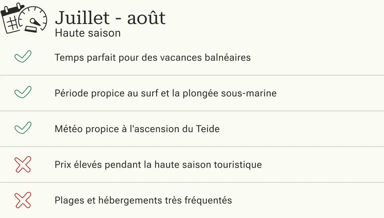 Les mois de juillet et août constituent la haute saison à Tenerife, si l'on tient compte du nombre de voyageurs. Pendant les vacances d'été, de nombreuses familles viennent se détendre sur la plage, barboter dans l'eau ainsi que se prélasser au bord des piscines d'hôtels. Au cœur de l'été, le soleil éclatant, les températures moyennes de 30°C et les précipitations quasi inexistantes font de Tenerife la destination parfaite pour des vacances balnéaires. Cependant, l'île peut alors devenir très fréquentée, et les hôtels et les plages sont généralement remplis à cette période. L'affluence des visiteurs engendre également une hausse des prix.
