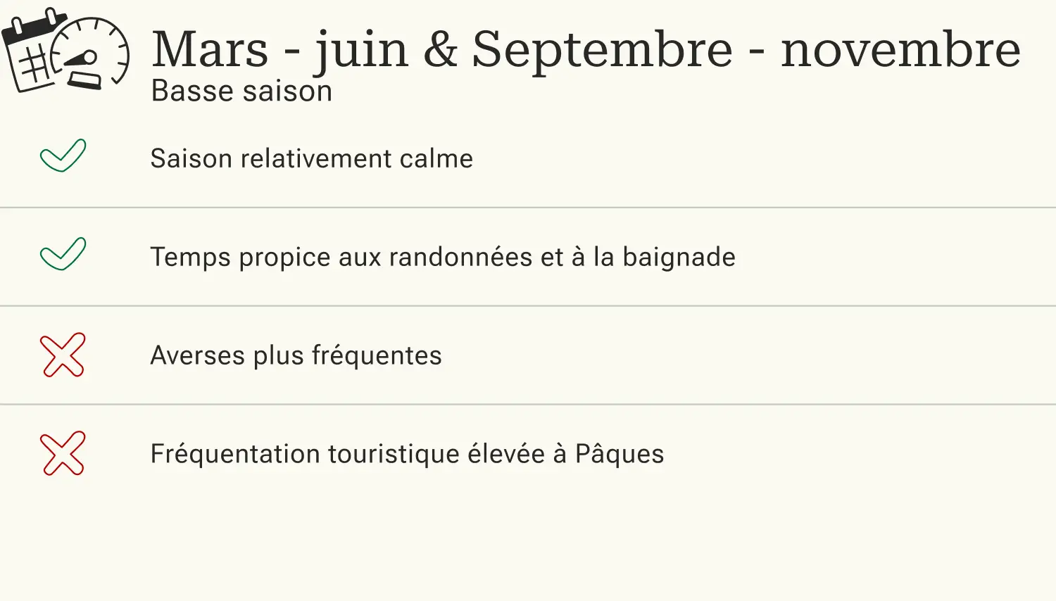 Pour ceux qui préfèrent le calme tout en étant actifs, le printemps et l'automne représentent alors les meilleures saisons de voyage. Le temps est alors clément pour se baigner, mais la chaleur reste tout de même modérée. De ce fait, les conditions météorologiques sont idéales pour les randonnées ainsi que la pratique d'autres activités sportives. Au printemps, la nature s'épanouit tandis qu'en automne, le soleil réchauffe l'atmosphère jusqu'au mois de novembre.