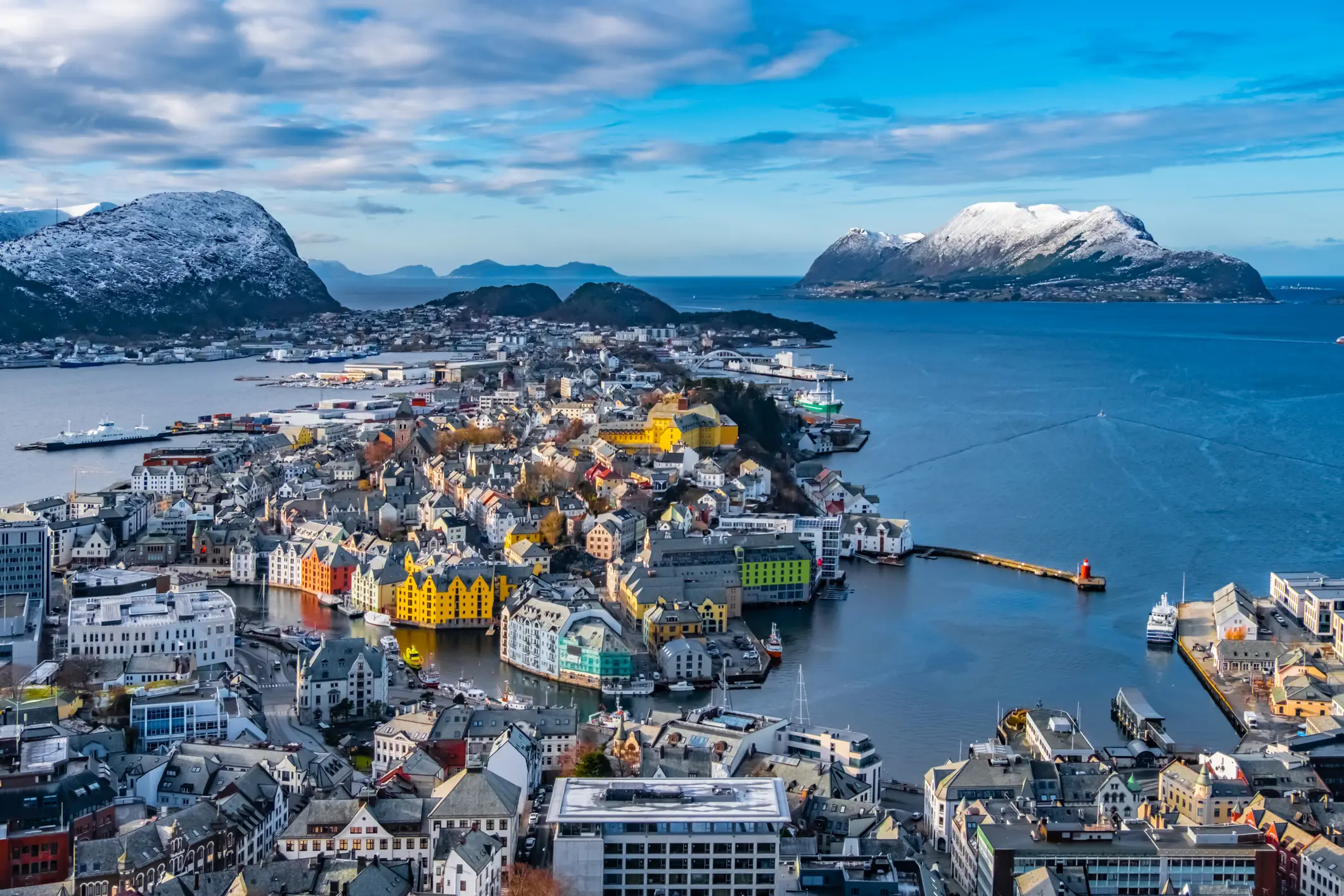 Reconstruite dans un style Art nouveau flamboyant, Ålesund s'étire sur un archipel à l'entrée des fjords. Les maisons colorées qui bordent le quai contrastent magnifiquement avec les Alpes enneigées de Sunnmøre qui servent d'arrière-plan à ce patchwork urbain.
