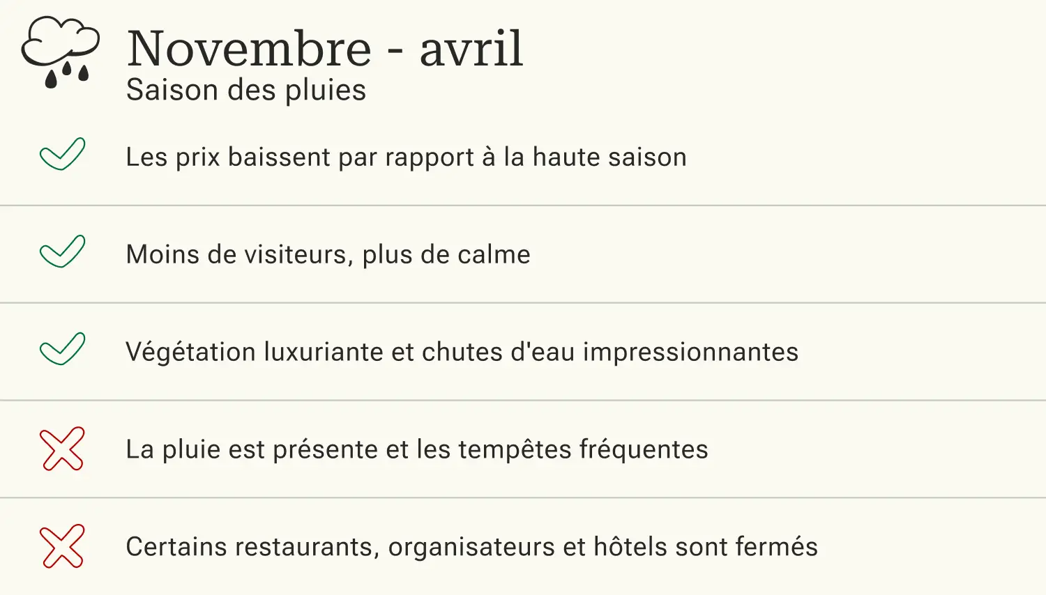 La saison des pluies commence en novembre et se termine vers le mois d'avril. La météo varie alors entre averses occasionnelles et plusieurs jours de pluie d'affilée. De plus, il peut également y avoir des tempêtes tropicales en début d'année, surtout dans l'ouest de l'archipel. Les températures augmentent alors de quelques degrés et l'atmosphère devient étouffante. La saison des pluies représente la basse saison durant laquelle certains restaurants et hôtels sont fermés. Néanmoins, si vous voyagez pendant cette saison-là, vous bénéficierez de journées au calme, sans trop d'affluence touristique.
