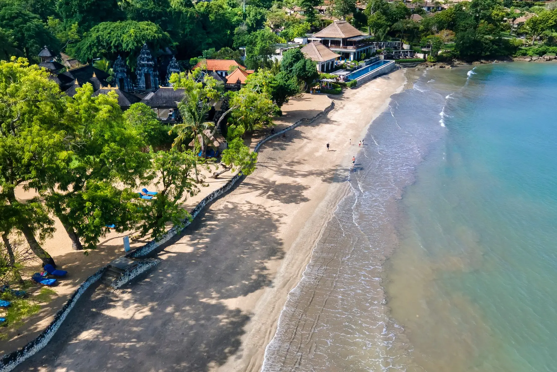 La plage de Jimbaran invite également à la baignade et à la détente avec son sable fin et clair et son eau calme. Choisissez un coin ombragé avec vue sur la mer turquoise, ou partez à la découverte des imposants rochers au bout de la plage avec vos enfants.