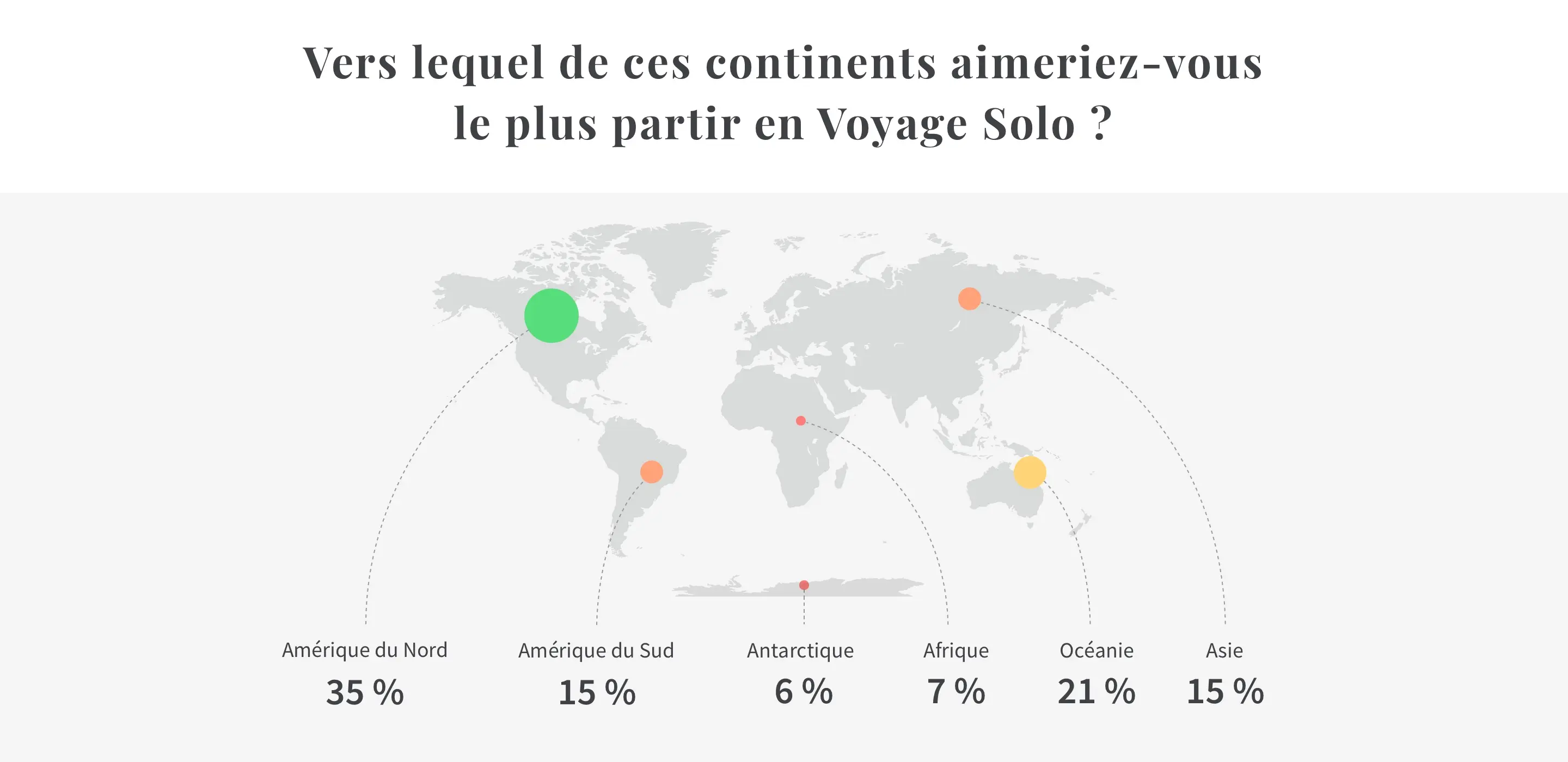 L’Amérique du Nord est la destination préférée pour un voyage en solo par plus d’un tiers des interviewées. On remarque aussi que les seniors entre 50 et 64 ans sont les plus nombreuses à choisir l’Océanie comme destination pour un voyage en solo (28 %).